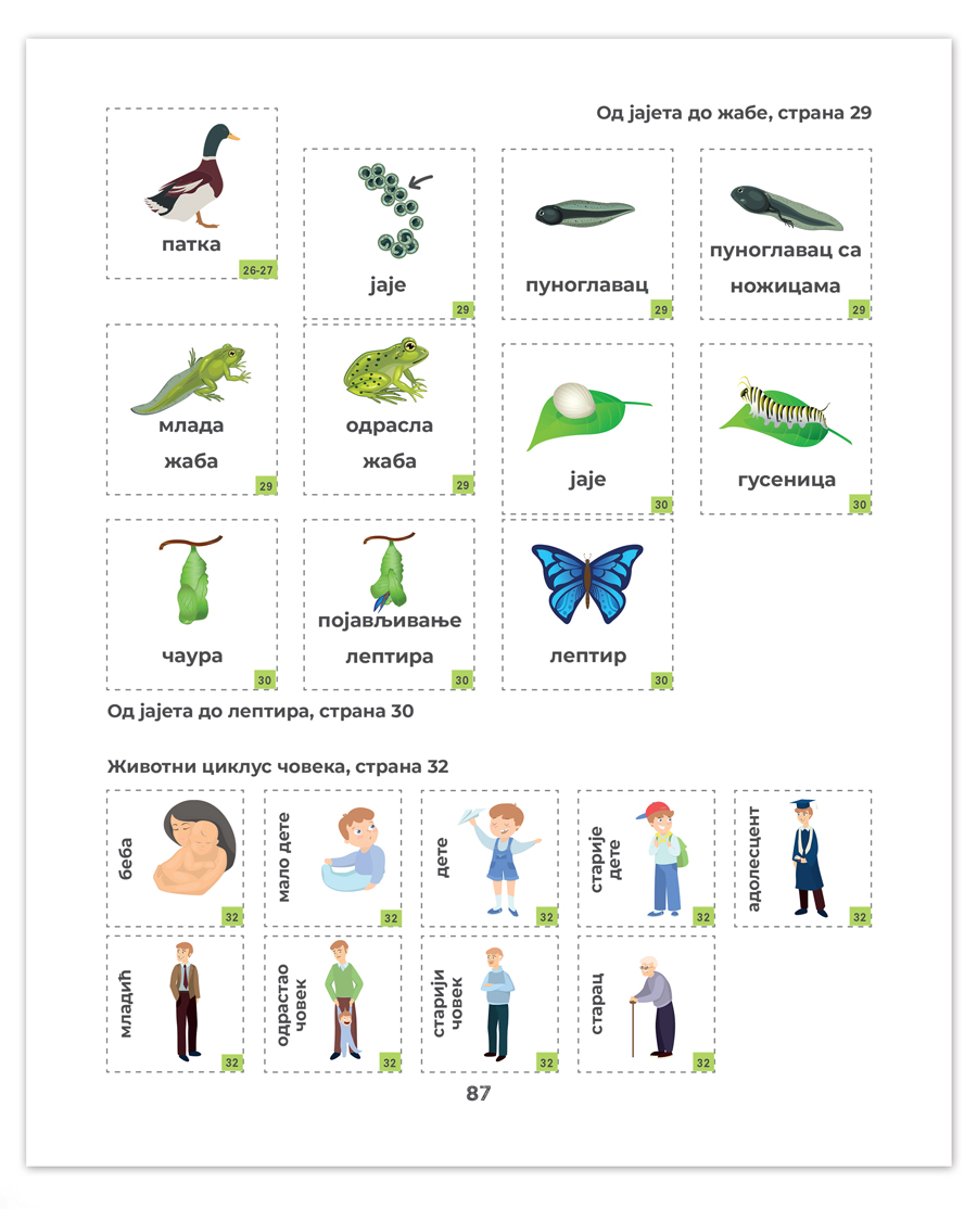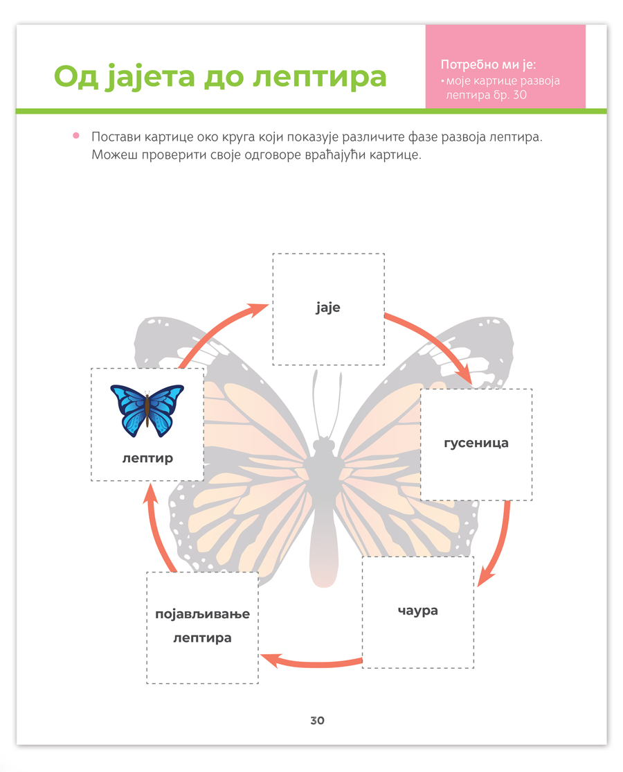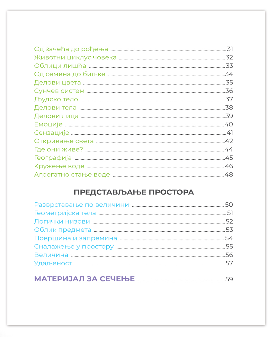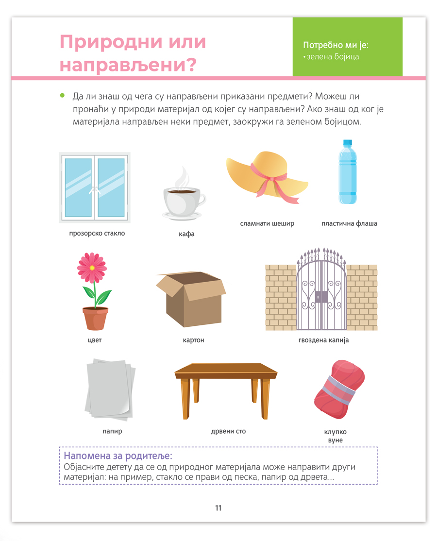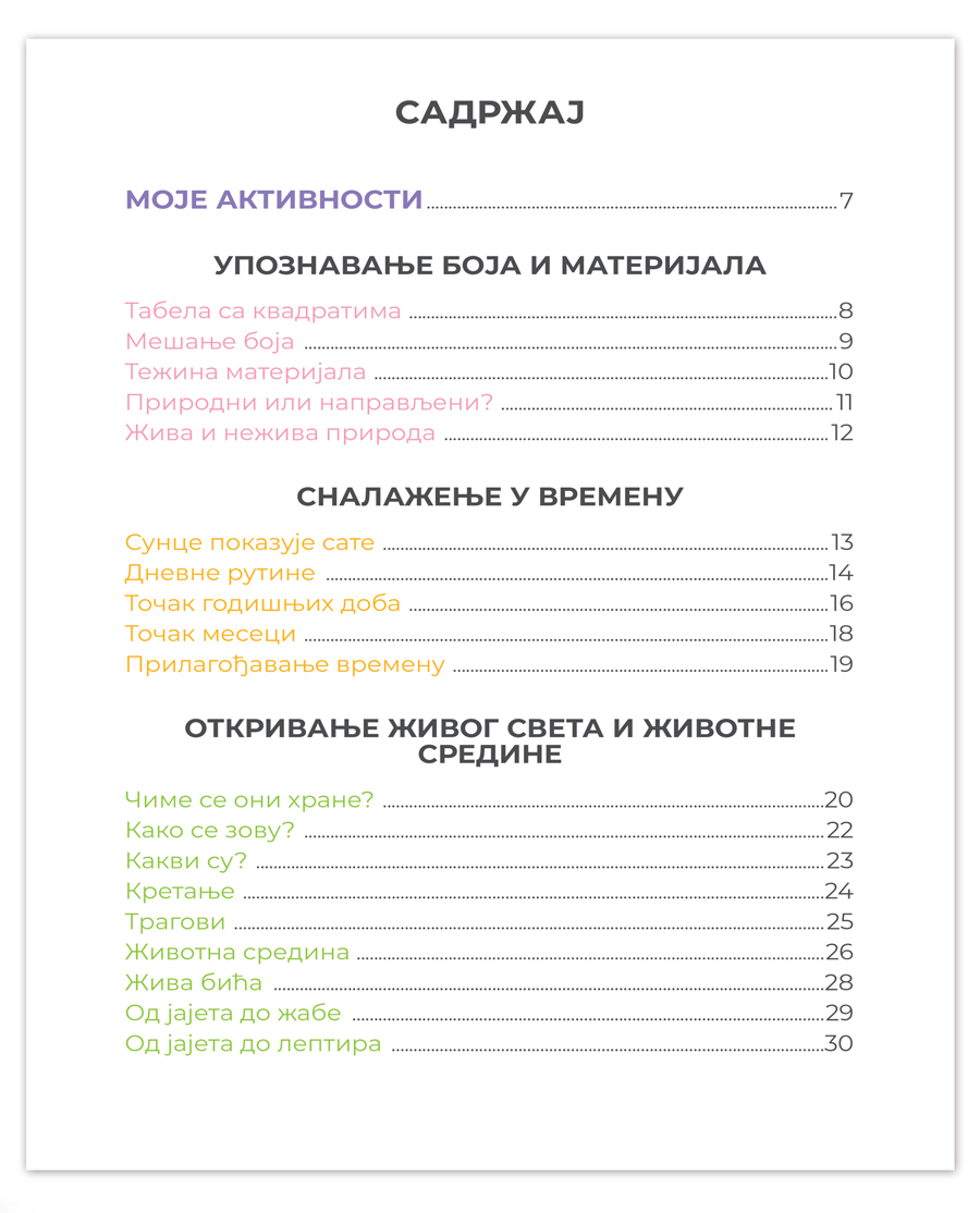 Na početku, vaše dete će otkriti materijale i boje, a mnogobrojne aktivnosti omogućiće mu da nauči da se snalazi u vremenu i prostoru. Pritom, dete će otkriti živi svet i svoje okruženje zahvaljujući karticama s životnim ciklusima, životinjama i biljkama. Od deteta će se tražiti da razvrstava, upoređuje, vizuelno razdvaja i manipuliše trodimenzionalnim geometrijskim telima. Kako bi realizovalo brojne aktivnosti, zasnovane na Montesori pedagogiji, dete će koristiti materijal koji je priložen na kraju sveske: