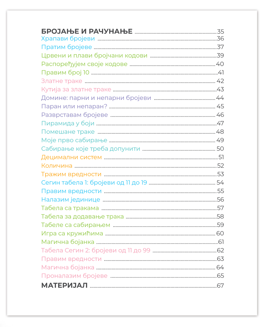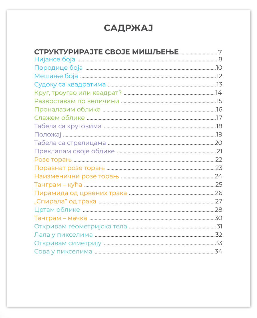 U prvom delu, kroz aktivnosti razvrstavanja i vizuelnog razdvajanja oblika, boja i veličina, dete će strukturirati svoje mišljenje. Od deteta će se tražiti da manipuliše, upoređuje, povezuje oblike i objekte, da preklapa (pomoću tangrama, sudoku oblika, karata za grupisanje). Ove vežbe odlična su osnova za pripremu učenja geometrije. U drugom delu, dete će učiti brojanje i računanje.