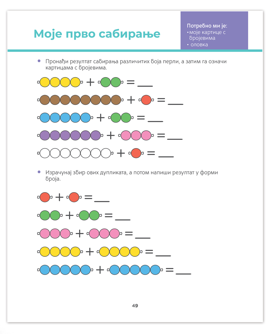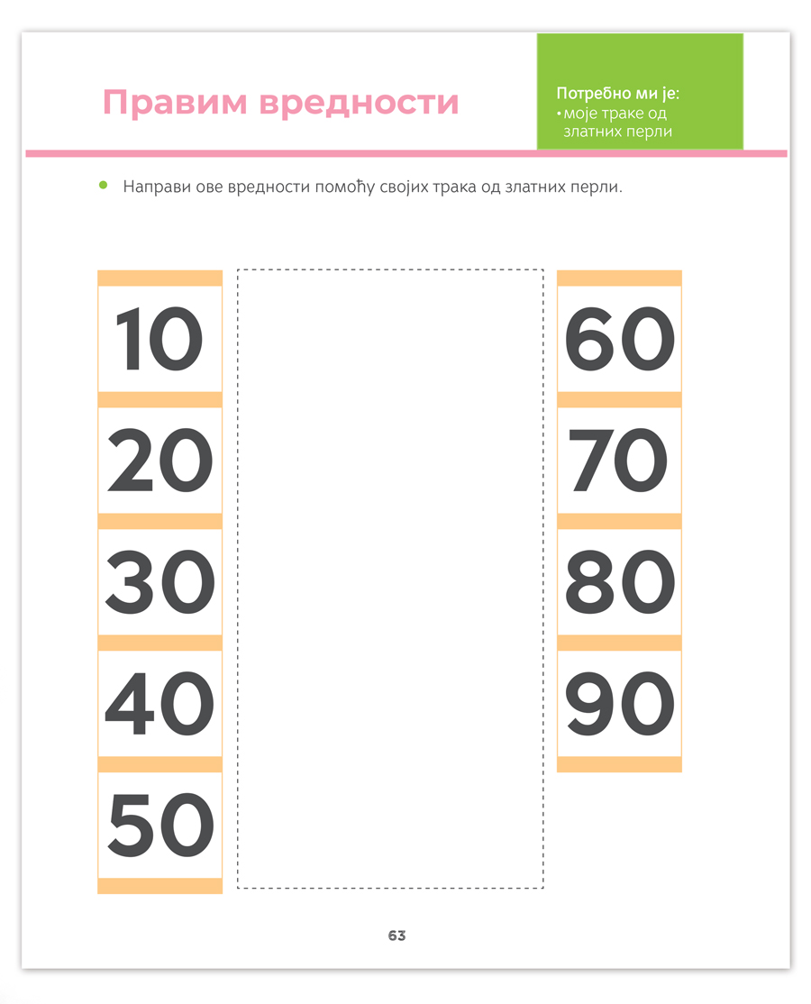 - obojene i zlatne perle i trake za brojanje, upoređivanje i dodavanje;