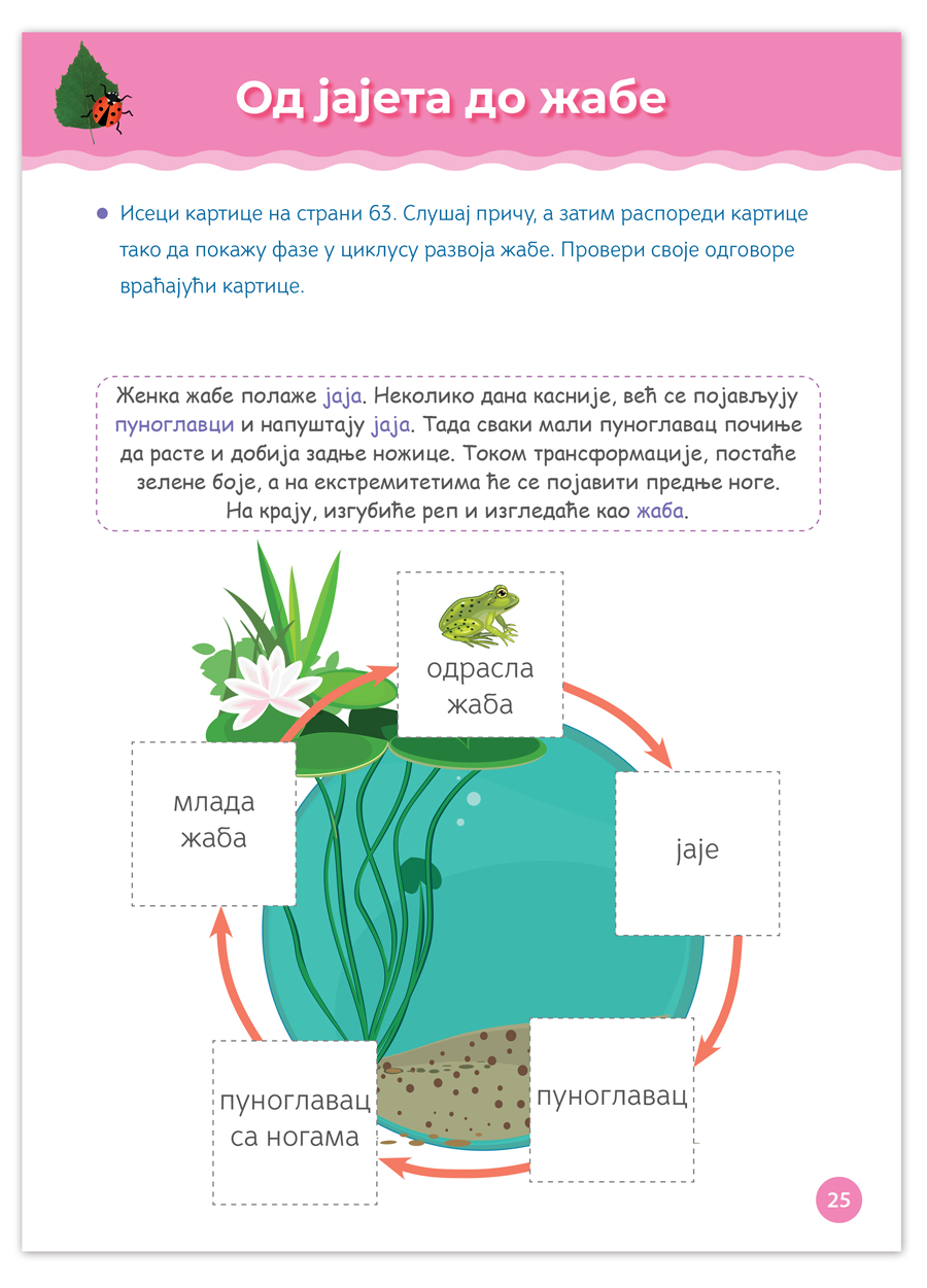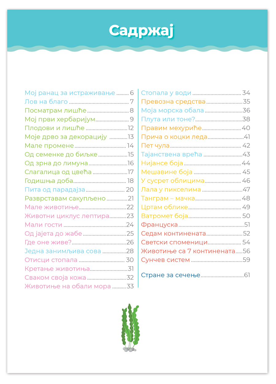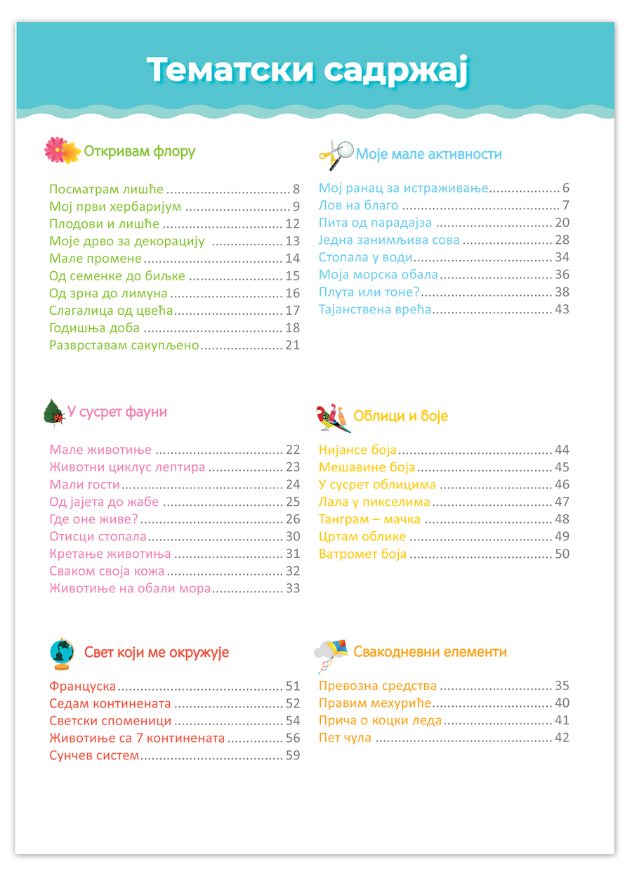 * upoznati biljke i životinje i pratiti različite faze njihovog razvoja, naučiti godišnja doba, oblike, eksperimentisati sa bojama i različitim agregatnim stanjima vode, kao i sa sastojcima i elementima s kojima se svakodnevno susreće;