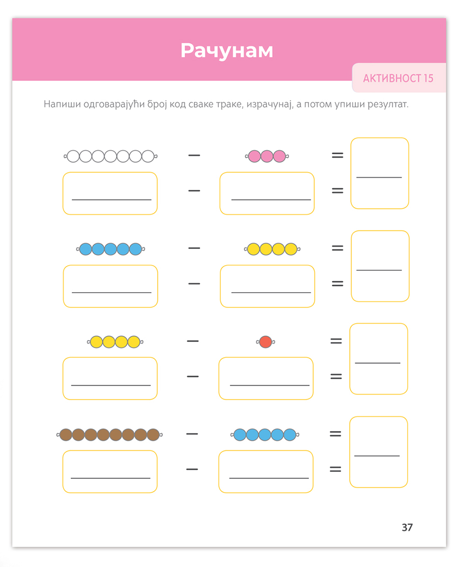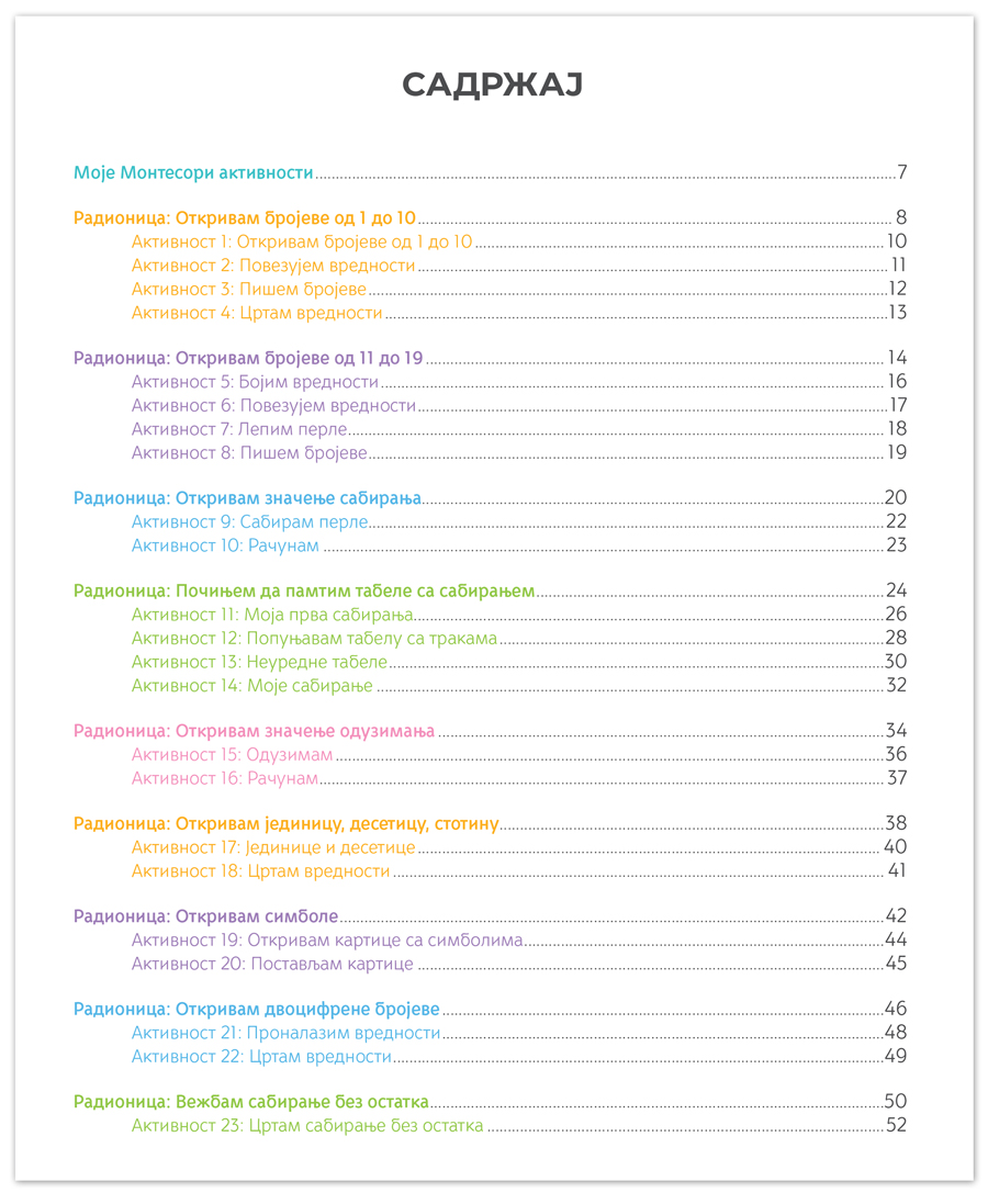 * stranice sa radionicama, koje će omogućiti detetu da se upozna sa brojevima, da postepeno shvati računanje (sabiranje sa ostatkom i bez ostatka, oduzimanje), kao i decimalni sistem.