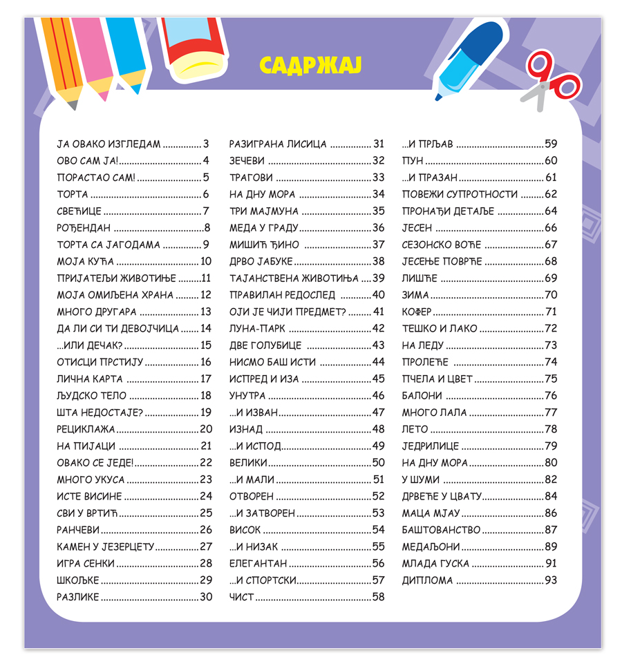 Radna sveska pred vama sadrži mnoštvo aktivnosti koje će podstaći dete da logički razmišlja i razvije fine grafomotoričke veštine. Dete će povezivati linije, učiti da broji, tražiti sličnosti i razlike, učiti odnose u prostoru, godišnja doba i još mnogo toga.
