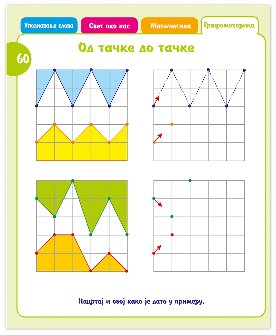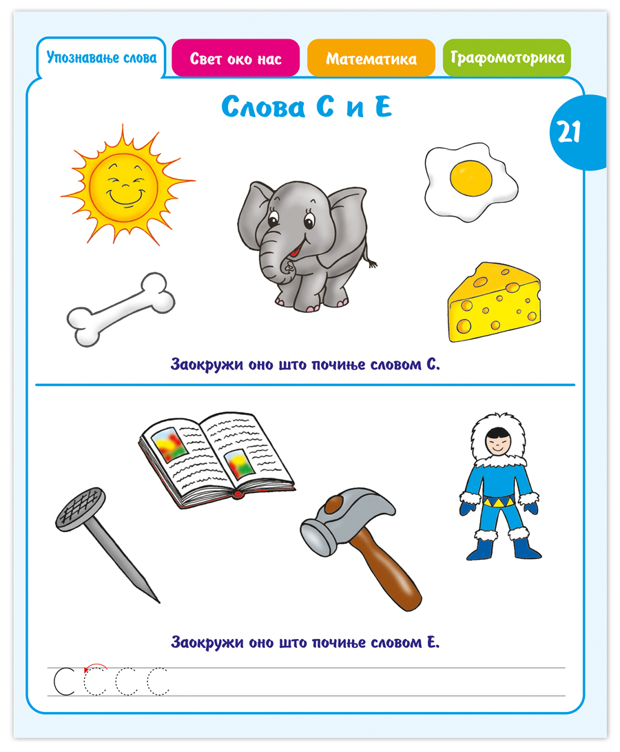 Radna sveska, zabavna MALA ŠKOLA, namenjena je deci uzrasta od 5-6 godina i u velikoj meri priprema decu mlađeg predškolskog uzrasta da na kreativan način stiču prva znanja iz matematike, živom i neživom svetu, o godišnjim dobima, jednom rečju o svemu onome što ih okružuje ali u mnogo većoj meri doprinosi prvim saznanjima o snalaženju i organizaciji u prostoru, veličinama predmeta i rasporedu u prostoru, sličnostima i razlikama predmeta, oblicima i pojmovima, prevoznim sredstvima, predmetima za ličnu higijenu, članovima porodice, itd. Kroz maštovite i kreativne zadatake u kojima je predviđeno da deca docrtavaju oblike iscrtane tačkicama, da raspoznaju i boje predmete, rešavaju prilično komplikovane matematičke i logičke zadatke, razlikuju domaće od šumskih ili morskih životinja, raspoznaju njihova staništa, čime se one hrane, da stiču prva saznanja o tome gde se uzgajaju koje vrste biljaka, o zanimanjima ljudi, itd. Akcenat je stavljen na samostalno prepoznavanje i pisanje slova, raspoznavanje reči koja počinju zadatim slovima. Svaka knjiga sadrži kao dodatak malu diplomu i nalepnice.