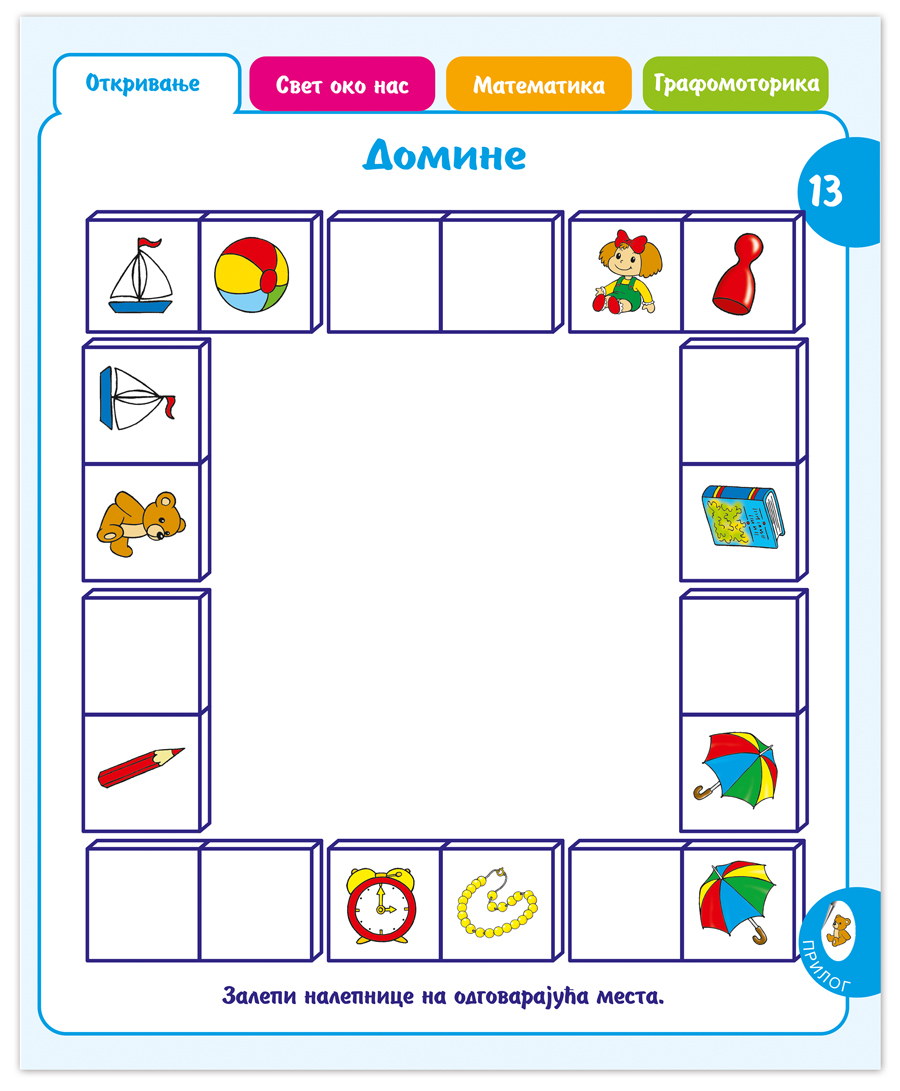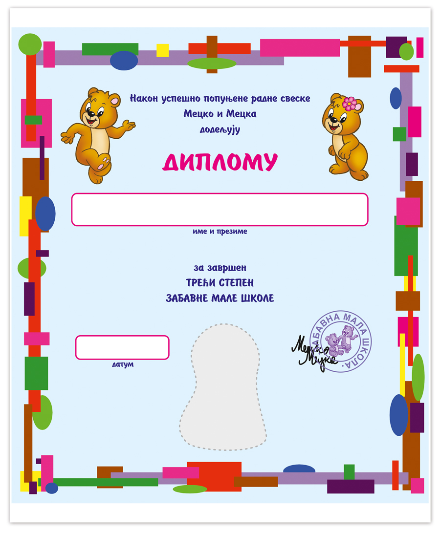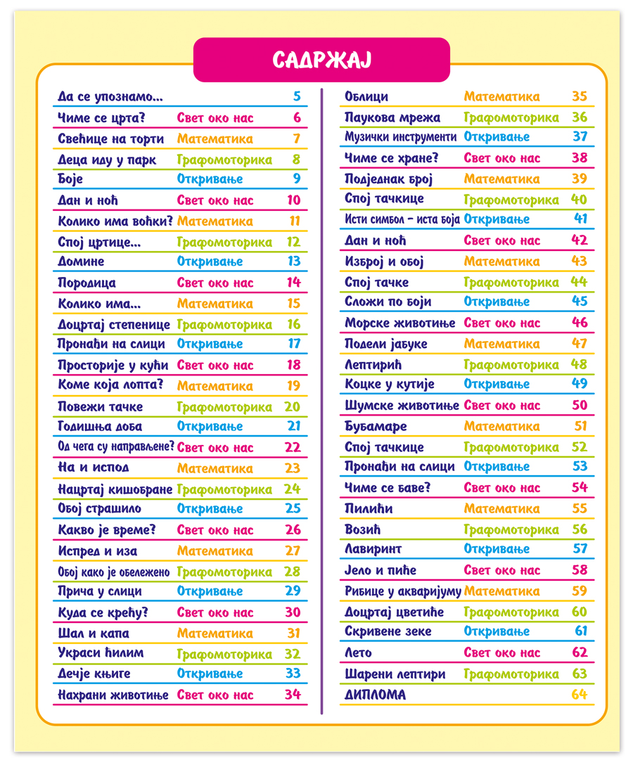 Radna sveska, zabavna MALA ŠKOLA, namenjena ranom predškolskom uzrastu dece od 4-5 godina na kreativan i maštovit način omogućava deci ovog uzrasta da stiču svoja prva saznanja iz matematike, prirode i društva, životinjskom i biljnom, živom i neživom svetu, godišnjim dobima, geometrijskim oblicima, saobraćaju, prevoznim sredstvima, ljudima oko sebe, članovima porodice, jednom rečju o svemu onome što ih okružuje. Kroz maštovite i jednostavne zadatake u kojima je predviđeno da deca kroz igru vežbaju moć zapažanja, da crtaju, docrtavaju ili boje nedovršene oblike, dopunjavaju slike, spajaju oblike iscrtane tačkicama, raspoznaju razne oblike i da ih boje, rešavaju prve matematičke i logičke zadatke, raspoznaju muzičke instrumente, gde žive životinje i čime se hrane, da slažu predmete u odgovarajuće oblike, učeći na taj način o odnosima u prirodi, veličinama, brojevima, domaćim, šumskim životinjama, saobraćaju, predmetima koji ih okružuju. Svaka knjiga sadrži kao dodatak malu diplomu i nalepnice.
