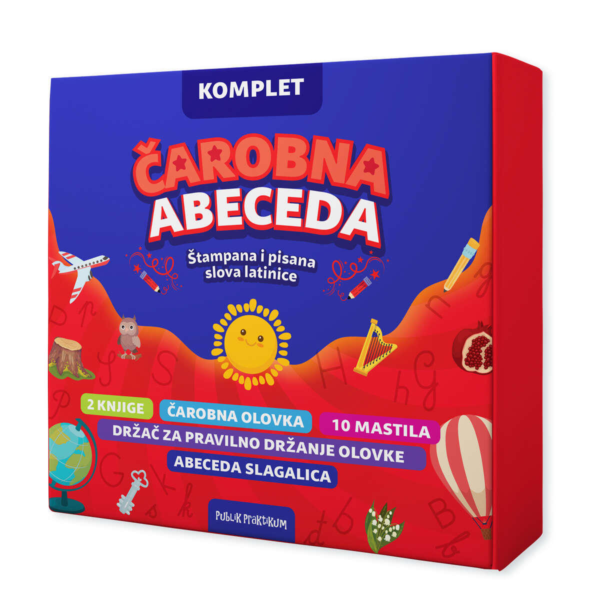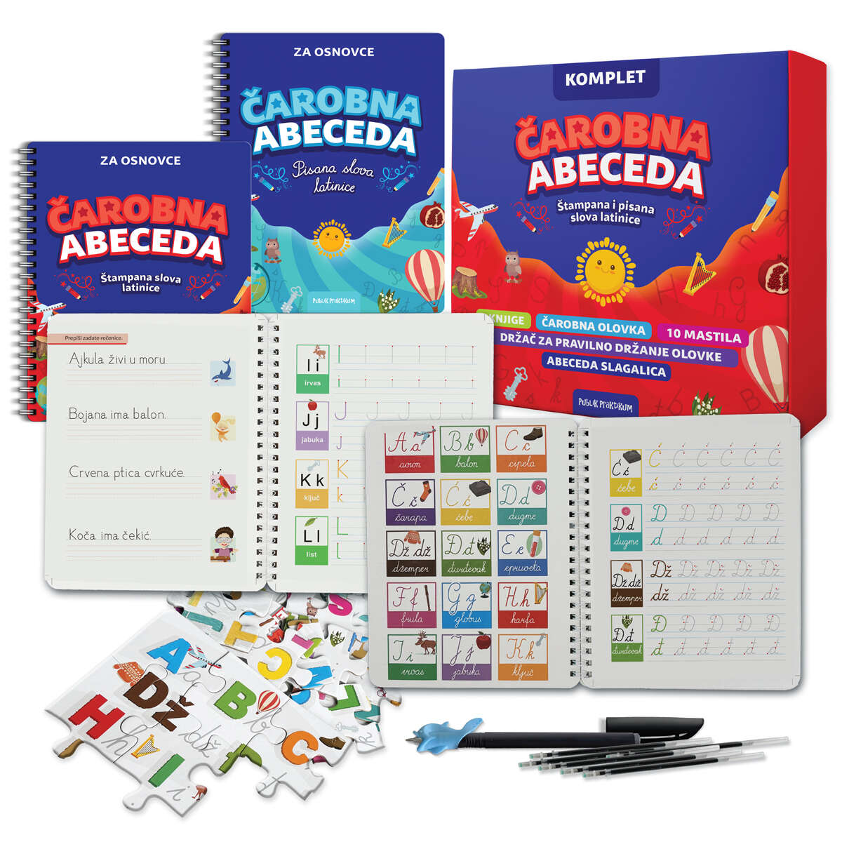 Edukativni komplet „Čarobna abeceda” pomaže deci pri pravljenju prvih koraka u svetu pisanja. Dizajniran je tako da ove rane veštine učini zanimljivima, dok istovremeno pomaže u razvoju fine motorike i koordinacije oko-ruka. Kako bi dete od prvog dana bilo sigurno i uspešno rešilo sve zadatke, u kompletu se nalazi gumeni držač za pravilno držanje olovke. Imaće priliku da, kroz vežbe pisanja po reljefno utisnutim slovima, piše iznova i iznova zahvaljujući čarobnom mastilu koje polako nestaje kad se osuši. Ove vežbe na jedinstven način aktiviraju mozak, podstiču kreativnost, poboljšavaju pamćenje, razumevanje i sposobnost učenja, a za dodatnu zabavu, na nekoliko strana nalaze se i zadaci iz pisanja slobodnom rukom.