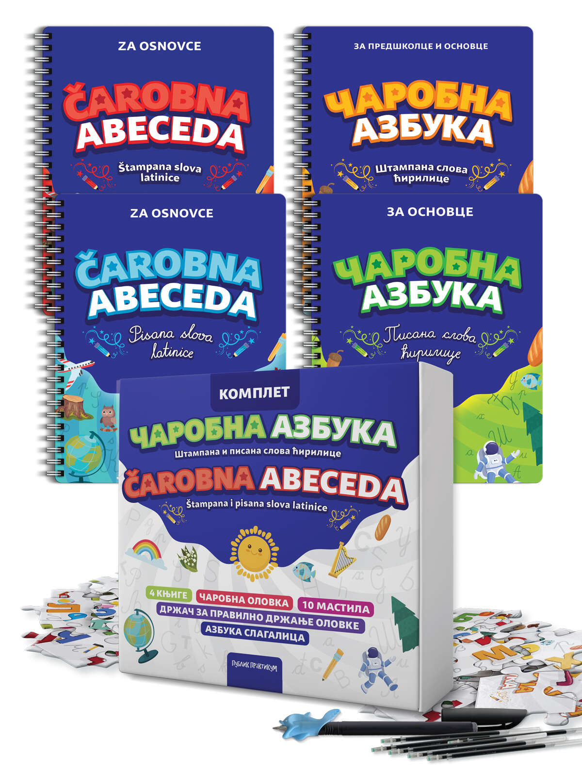 Edukativni komplet „Čarobna azbuka i Čarobna abeceda” pomaže deci pri pravljenju prvih koraka u svetu pisanja. Dizajniran je tako da ove rane veštine učini zanimljivima, dok istovremeno pomaže u razvoju fine motorike i koordinacije oko-ruka. Kako bi dete od prvog dana bilo sigurno i uspešno rešilo sve zadatke, u kompletu se nalazi gumeni držač za pravilno držanje olovke. Imaće priliku da, kroz vežbe pisanja po reljefno utisnutim slovima, piše iznova i iznova zahvaljujući čarobnom mastilu koje polako nestaje kad se osuši. Ove vežbe na jedinstven način aktiviraju mozak, podstiču kreativnost, poboljšavaju pamćenje, razumevanje i sposobnost učenja, a za dodatnu zabavu, na nekoliko strana nalaze se i zadaci iz pisanja slobodnom rukom.