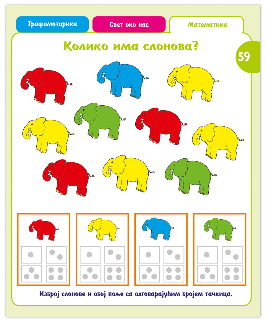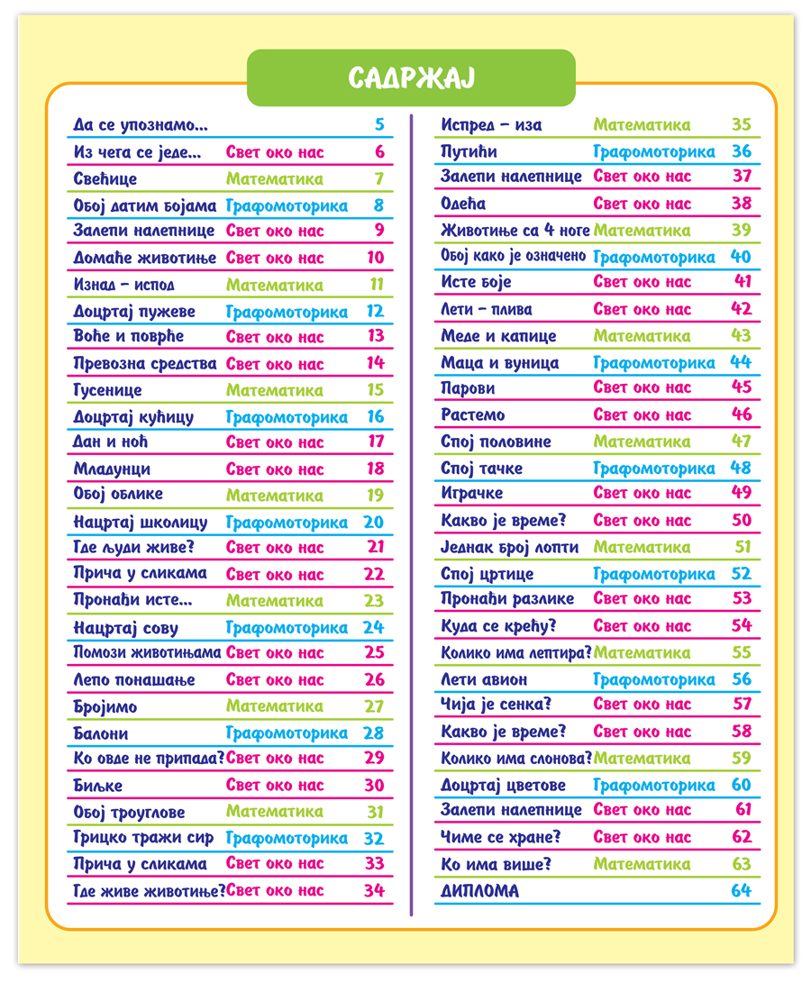 Radna sveska, zabavna MALA ŠKOLA, namenjena uzrastu dece od 3-4 godine, na maštovit način omogućava deci ovog uzrasta da vežbaju moć opažanja i razvijaju logičko razmišljanje i stiču svoja prva saznanja iz geometrijskih oblika, prirode i društva, da uče o životinjskom i biljnom, živom i neživom svetu, godišnjim dobima, saobraćaju i prevoznim sredstvima, o ljudima oko sebe, jednom rečju o svemu onome što ih okružuje. Kroz raznovrsne maštovite i jednostavne zadatake u kojima je predviđeno da deca kroz igru crtaju, docrtavaju nedovršene oblike, dopunjavaju ili boje slike, spajaju oblike iscrtane tačkicama, uče nove i raspoznaju oblike i da ih boje, rešavaju prve logičke zadatke, razlikuju domaće od šumskih ili morskih životinja, da uče o mestima na kojima životine žive i čime se hrane, da slažu predmete u odgovarajuće oblike, učeći na taj način o odnosima u prirodi, oblicima, veličinama, brojevima, saobraćaju, predmetima koji ih okružuju. Svaka knjiga sadrži kao dodatak malu diplomu i nalepnice.