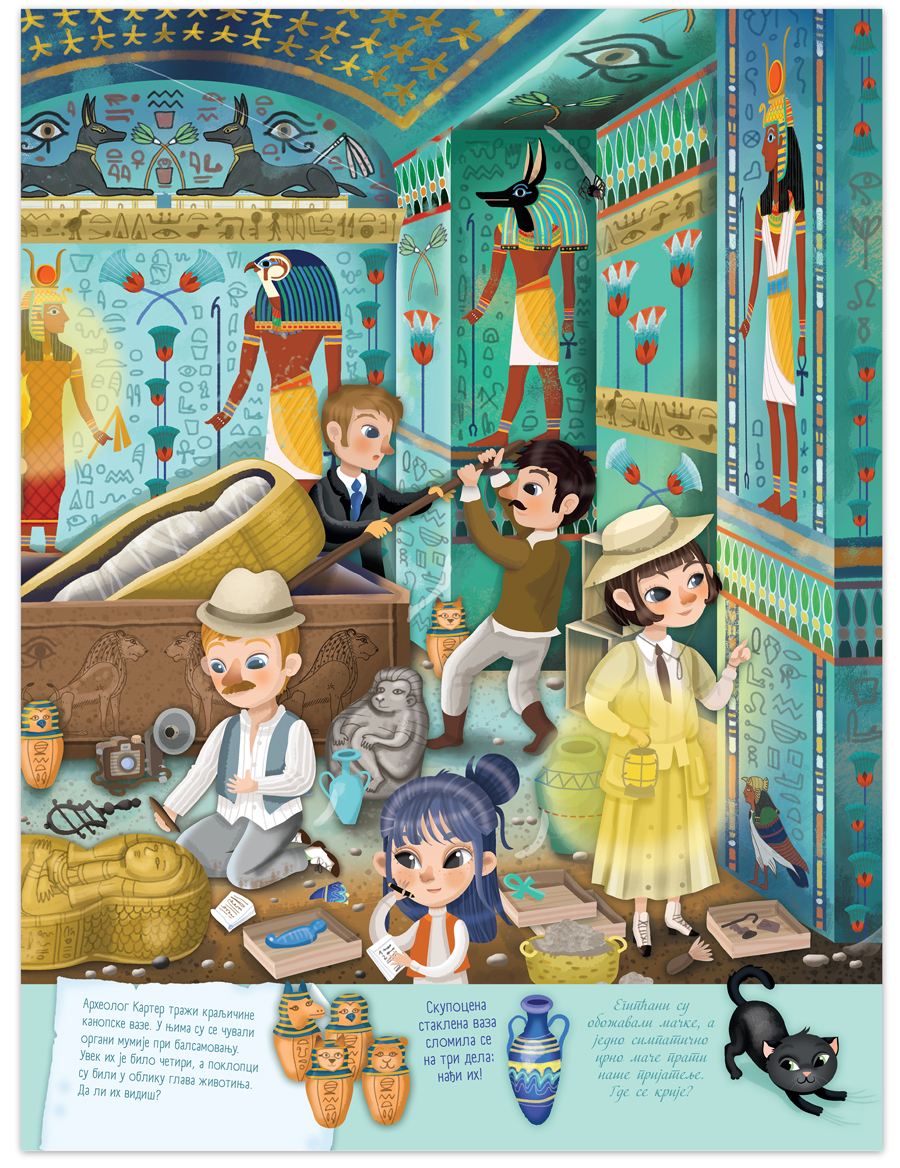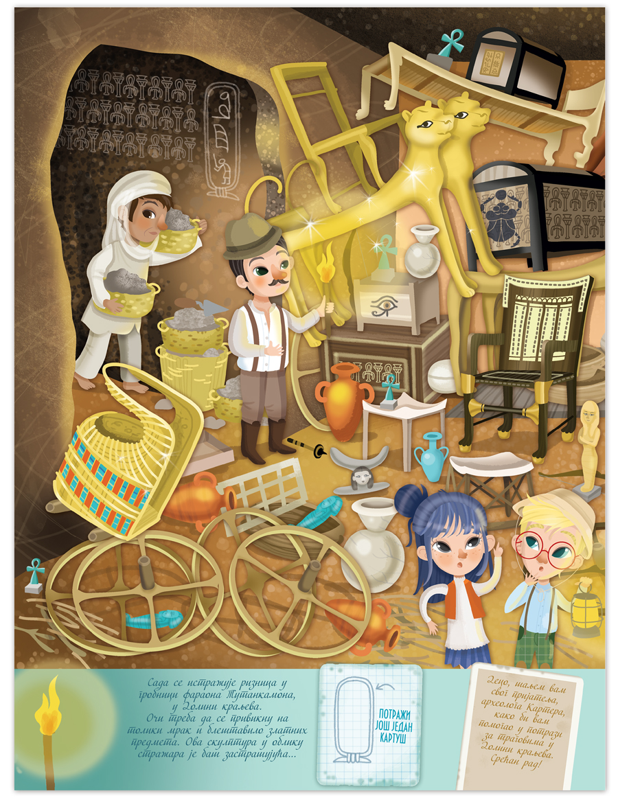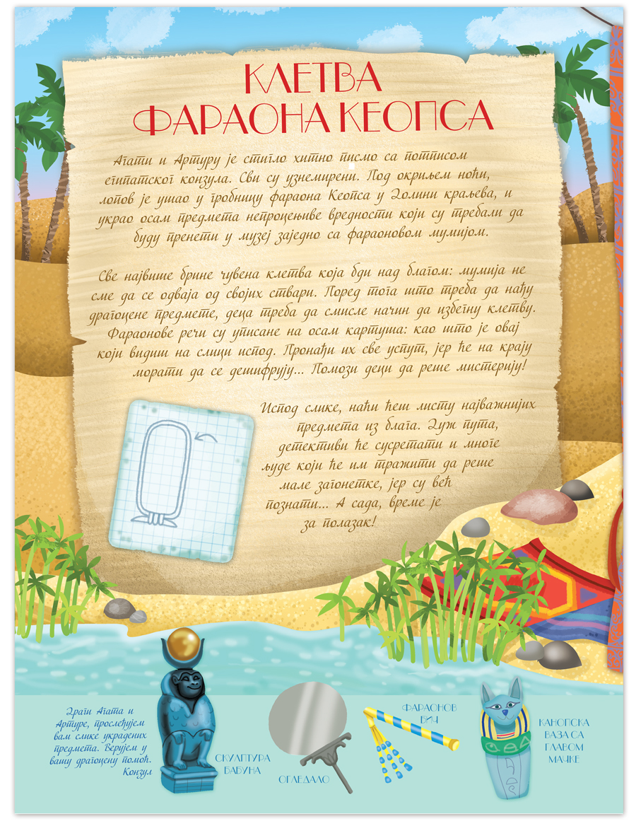 U Egiptu se dogodila velika krađa: ukradeno je blago iz faraonove grobnice. Agata i Artur pokušavaju da reše misteriju, ali im je potrebna pomoć da pronađu krivca. Na dnu svake stranice nalaze se uputstva koje deca treba da prate u ovoj nezaboravnoj avanturi. Ukoliko im zatreba pomoć na poslednjim stranicama se nalaze rešenja svih zadataka.