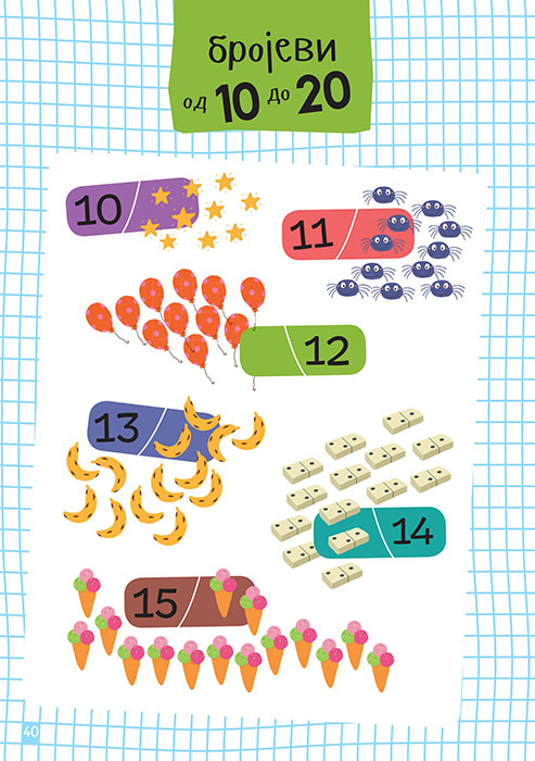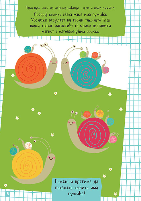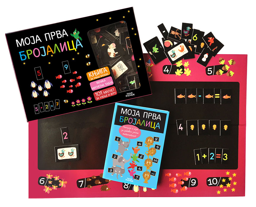 Knjiga na 48 strana + Velika magnetna tabla + 101 magnet za učenje i igru! Uz pomoć ove knjige jednostavno i lako dete će naučiti da broji od 1 do 20.