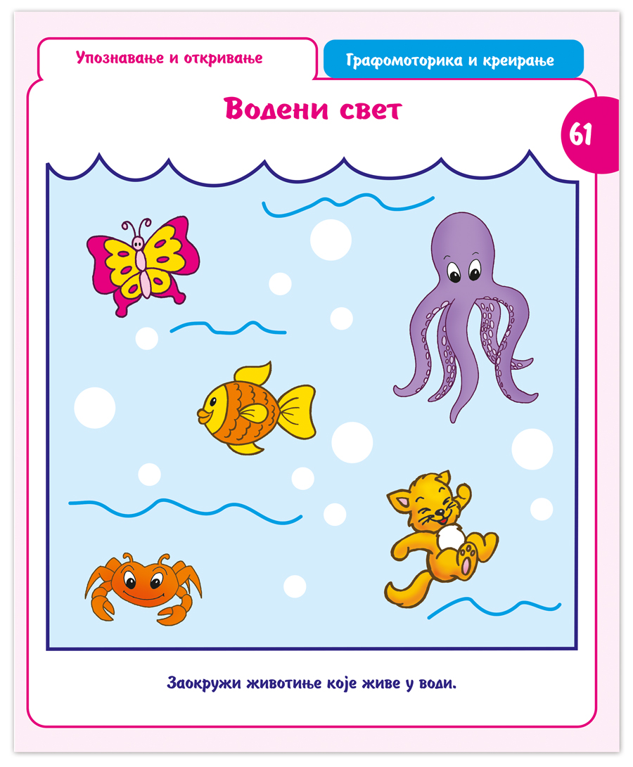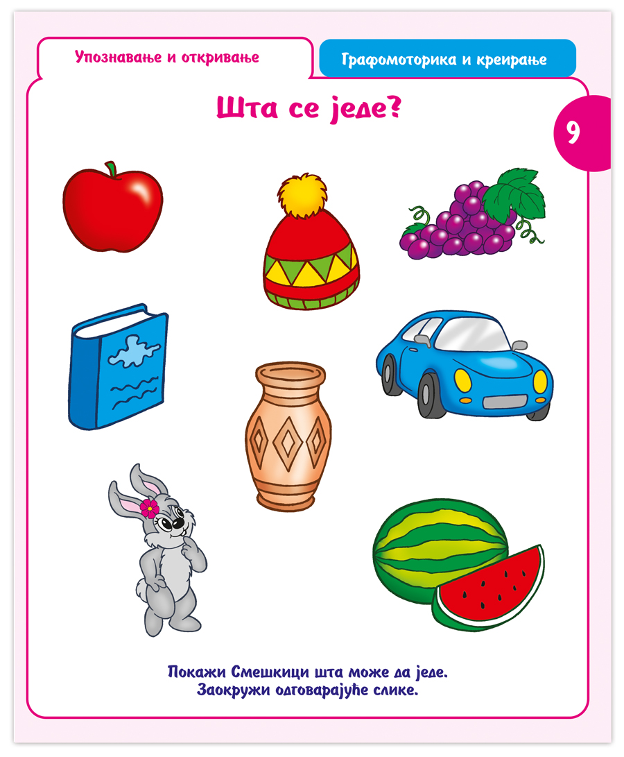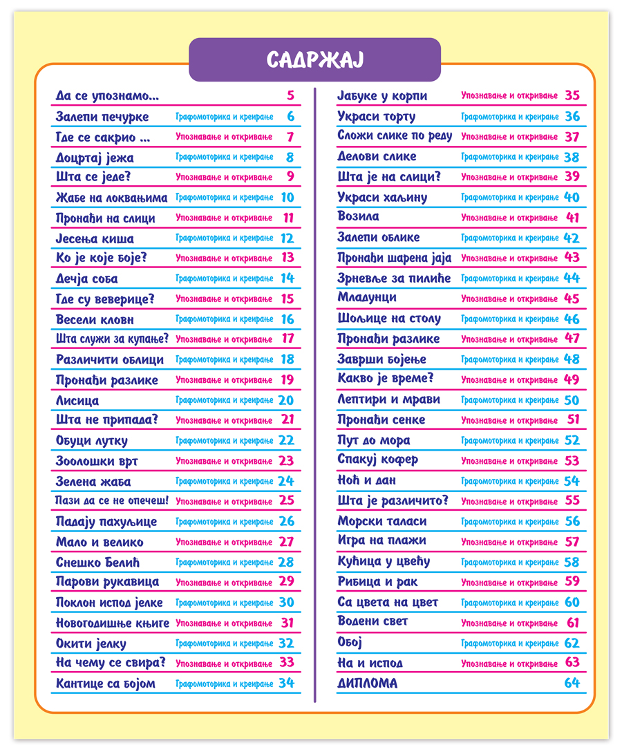 Radna sveska, zabavna MALA ŠKOLA namenjena najmlađem uzrastu dece uzrasta od 2-3 godine, na slikovit i odgovarajući način omogućava deci ovog uzrasta da vežbaju moć opažanja i razvijaju logičko razmišljanje i da stiču svoja prva saznanja iz prirode i društva, saznanja o životinjskom i biljnom svetu, živim i neživim bićima, godišnjim dobima, saobraćaju i prevoznim sredstvima, ljudima oko sebe, članovima porodice, jednom rečju o svemu onome što ih okružuje. Kroz raznovrsne zabavne i jednostavne zadatake u kojima je predviđeno da deca kroz igru crtaju, docrtavaju i boje oblike predmeta iscrtane tačkicama, da uče boje i oblike, rešavaju prve logičke zadatke, da razlikuju domaće od šumskih ili morskih životinja, mesta na kojima oni žive i čime se hrane, da slažu predmete u odgovarajuće oblike, učeći na taj način o odnosima u prirodi, oblicima, veličinama, brojevima i predmetima koji nas okružuju. Svaka knjiga sadrži kao dodatak malu diplomu i nalepnice.